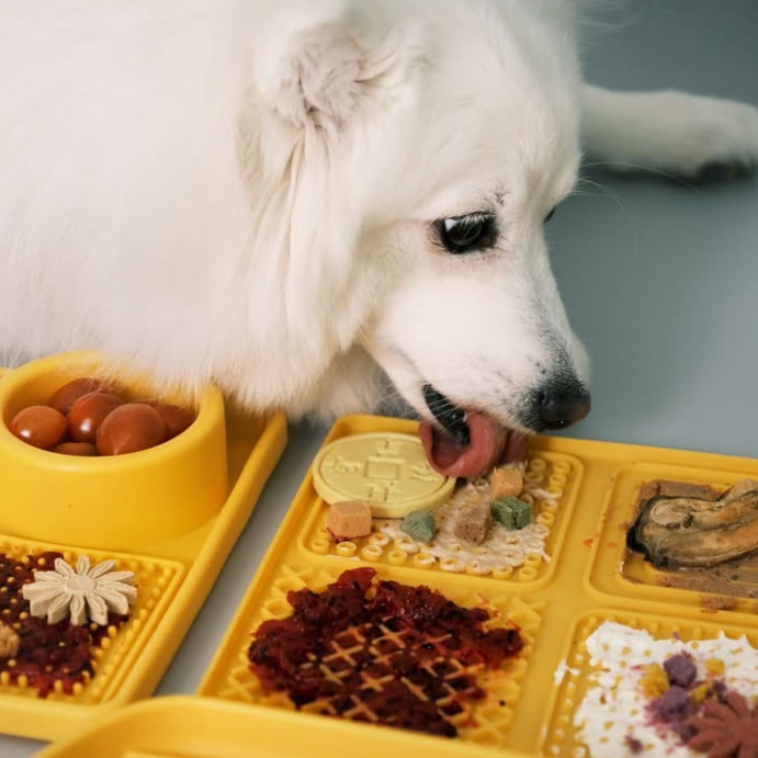 A dog grooming distraction mat works by engaging a dog’s natural licking instinct. When dogs focus on licking soft treats such as peanut butter, yogurt, or wet food spread on the mat, they become calmer and more cooperative.
